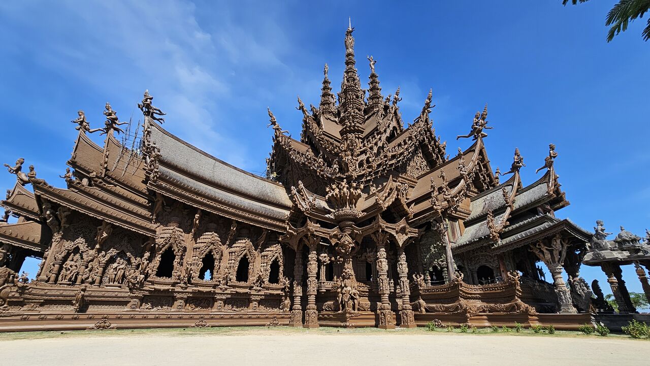 ここに来るのは2回目、木造建築の寺院でまだ建築途中、タイのサグラダファミリアと言われていて完成まであと10年は掛かる感じなんだけど「人間とは何か」と言う事を彫刻で物語として表現されており意味を理解することで己の浅はかさ、未熟さ、弱さ、傲慢さ...と言った部分を振り替えさせてくれる場所だ。