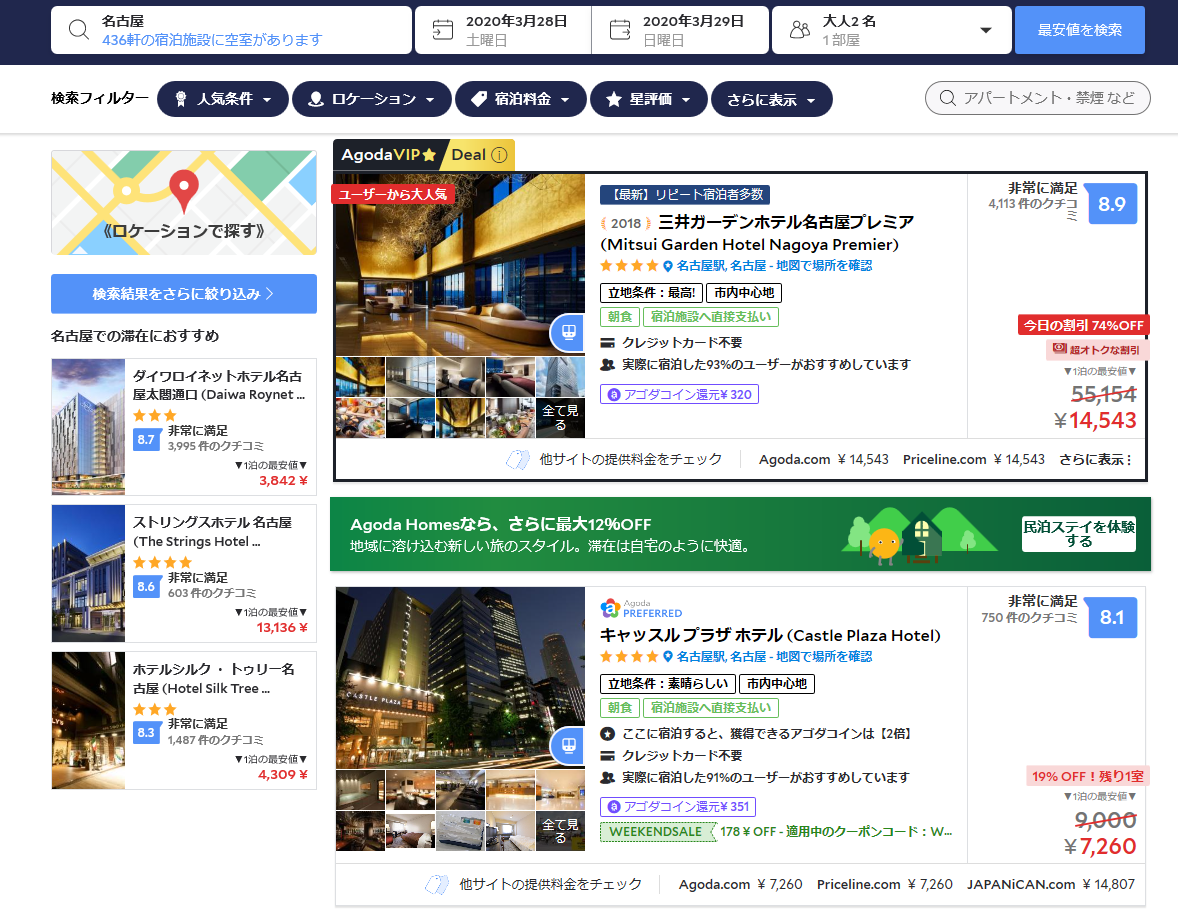 ホテル選びは、いつもは楽天トラベル、トラベルコちゃん、アゴダの順番にお値打ちなホテルが無いか探すんだけど、アゴダでは何と名古屋市内の高級ホテルが70〜89%オフで出ている状態で驚いた!