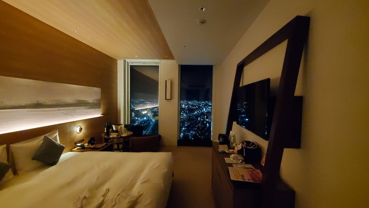 風呂上がりに真っ裸で部屋の中をウロウロしたけど、ここまで高層階だと下界から超望遠レンズで見ようと思っても見れないレベルだと思いますが、チェックイン後に下から見たら部屋の中は見えにくい様なガラスになってました。