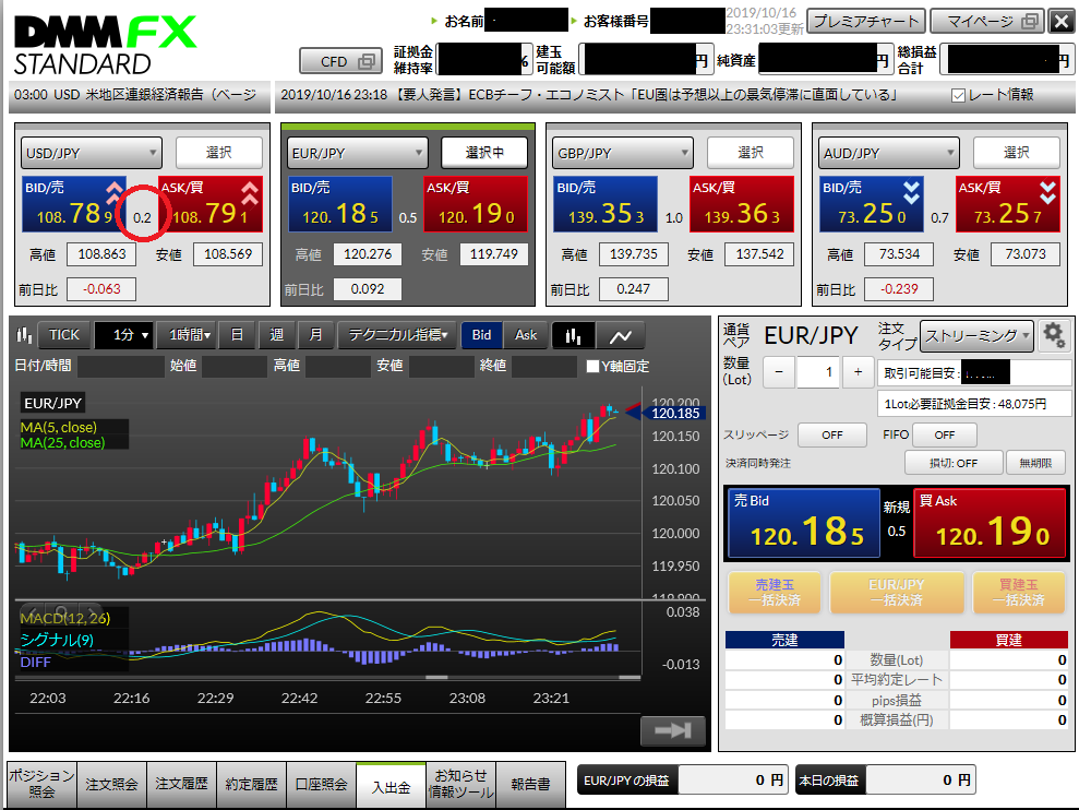 今まではDMMの証券会社でFX取引をしていたけど、先週のヨーロッパの指標発表で下がったところを買いで入ったら、さらに下げて損切ラインに引っ掛かり、結局‐7万ぐらいの損失を出してしまった。この時は底値に対して2pipsぐらいの差しか無く、最近0.1pipsでロスカットに引っ掛かったりと本当にそんな事が続いていて、どうもDMMとは相性が悪い。