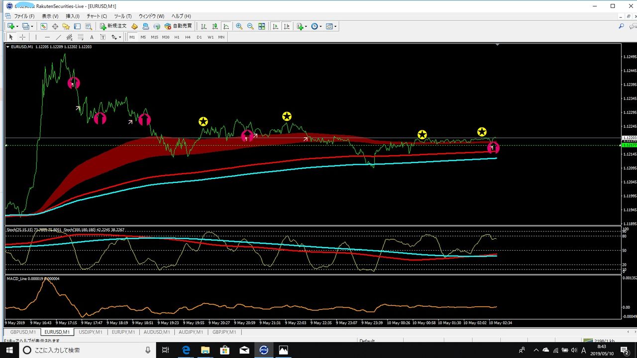 合わせて今回はもってぃーさんの「ゲイスキャFX」を表示させて、ラインチャートをロウソク足に変えてシグナルを見ながらエントリーをしたんだけど、この場合だと微妙なローソク足の陰線と陽線を見ることによって勝率がUPする事を発見!